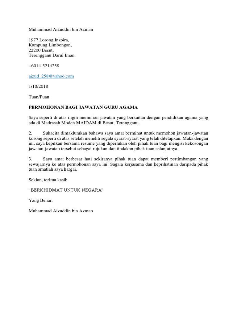 Contoh cover letter bahasa melayu memohon kerja 2020.